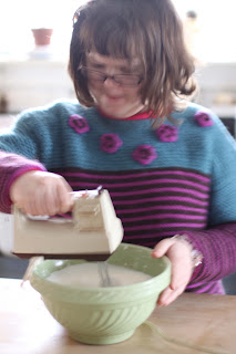 She mixed her little heart out. All of a sudden, the cream started turning yellow and the "buttermilk" began weeping out of it. We had done it! It's really nice to see her have interest in something like this.