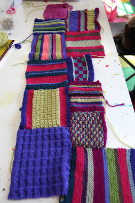 I taught them how to turn them into an afghan. We also learned how to dye their swatches with acid dyes so that they could turn their "wrong color" swatches into a shade that would work with the rest of their swatches. Here is some of the progress that was made.